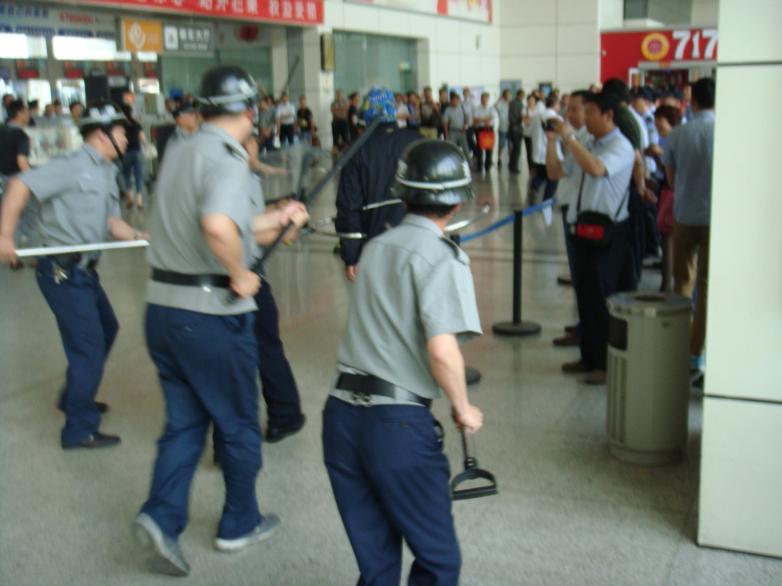 6月12日下午4點05分,演練模擬了揚州汽車東站售票大廳里兩名手持砍刀的歹徒正往候車廳方向晃悠,值班保安發(fā)現(xiàn)這一險情后,車站迅速啟動應急預案,車站保衛(wèi)人員協(xié)同車站一線職工緊急疏散乘客,使乘客有序、安全撤離現(xiàn)場,隨即,6名防暴隊員手持鋼叉、齊眉棍、警棍,將兩名手拿砍刀的暴徒團團圍住,經(jīng)過短短幾分鐘的對持和搏斗,兩名歹徒終于被制服,并被隨后趕來的民警帶走……