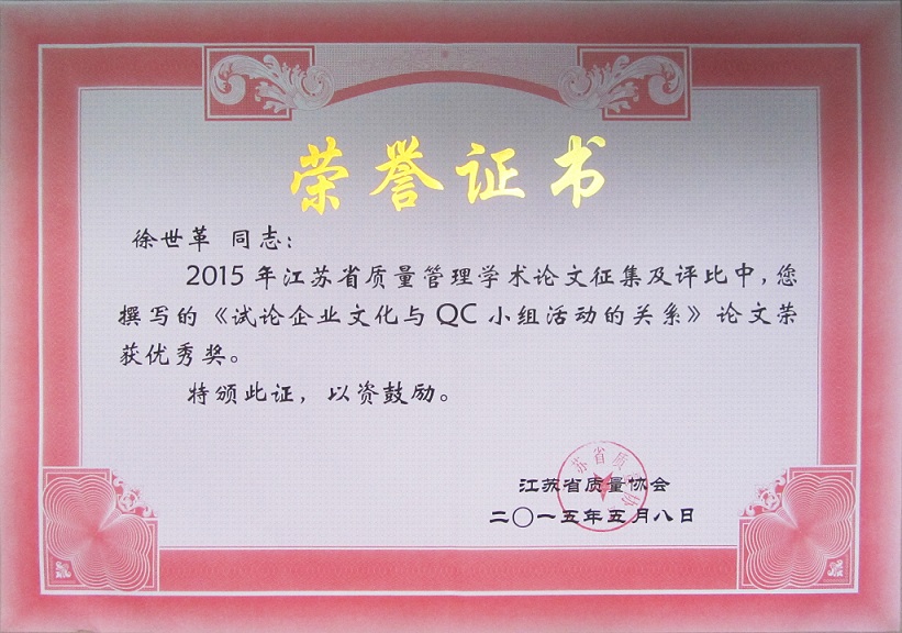 由江蘇省質(zhì)量協(xié)會(huì)舉辦的2014年江蘇質(zhì)量管理學(xué)術(shù)論文征集評(píng)選活動(dòng)落下帷幕,5月8日在南京華江賓館召開了江蘇質(zhì)量管理學(xué)術(shù)論文表彰暨交流會(huì),江蘇省質(zhì)量技術(shù)監(jiān)督局副局長(zhǎng)張前、質(zhì)量處處長(zhǎng)兼省質(zhì)量協(xié)會(huì)副秘書長(zhǎng)祁寧清、省質(zhì)量協(xié)會(huì)會(huì)長(zhǎng)耿寧等及獲獎(jiǎng)作者參加了會(huì)議。集團(tuán)公司徐世革同志的《試論企業(yè)文化與QC小組活動(dòng)的關(guān)系》榮獲優(yōu)秀獎(jiǎng)。
