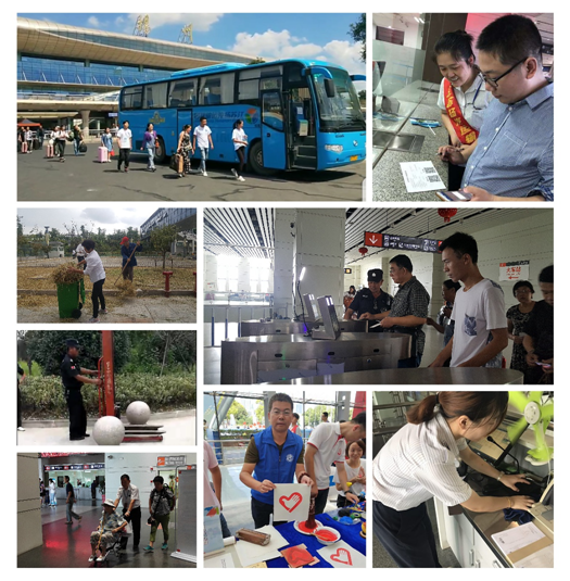 車站各班組分工協(xié)作打掃各自責(zé)任區(qū)域,清掃工作臺(tái)、參加"志愿服務(wù) 美好你我他"第三屆江蘇志愿服務(wù)展示交流活動(dòng)、清掃路邊綠化帶、噴灑藥水、除雜草滅蟲害、整理通道入口、設(shè)備設(shè)施維護(hù)、消防安全檢查、身份實(shí)名驗(yàn)證、檢查危險(xiǎn)禁運(yùn)物品、檢查客車安全帶、為特殊旅客提供一站式服務(wù)、熱情引導(dǎo)購(gòu)票、候車,征詢旅客意見、開展問卷調(diào)查,以整潔的站區(qū)環(huán)境、良好的精神風(fēng)貌和優(yōu)質(zhì)的候乘服務(wù)當(dāng)好東道主,文明迎盛會(huì)。