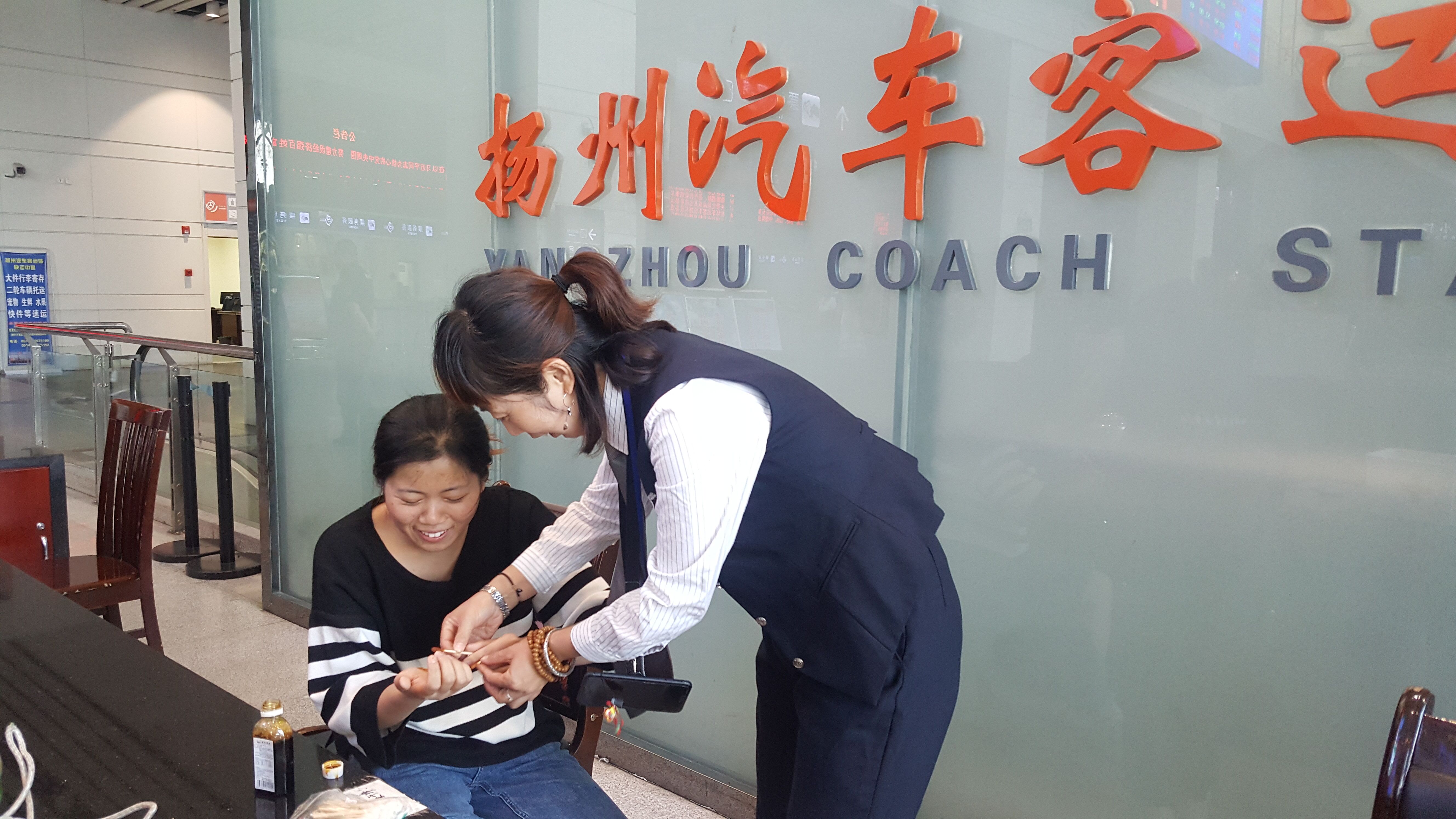 今天(10月11日)下午3時(shí)許,揚(yáng)州西部客運(yùn)樞紐售票大廳門口,一位年輕女子背著行李,一瘸一拐痛苦地邁進(jìn)了汽車站售票大廳,見此情形,眼尖心細(xì)的服務(wù)班工作人員殷俊,迅速跑上前去,攙扶著該女士坐下。