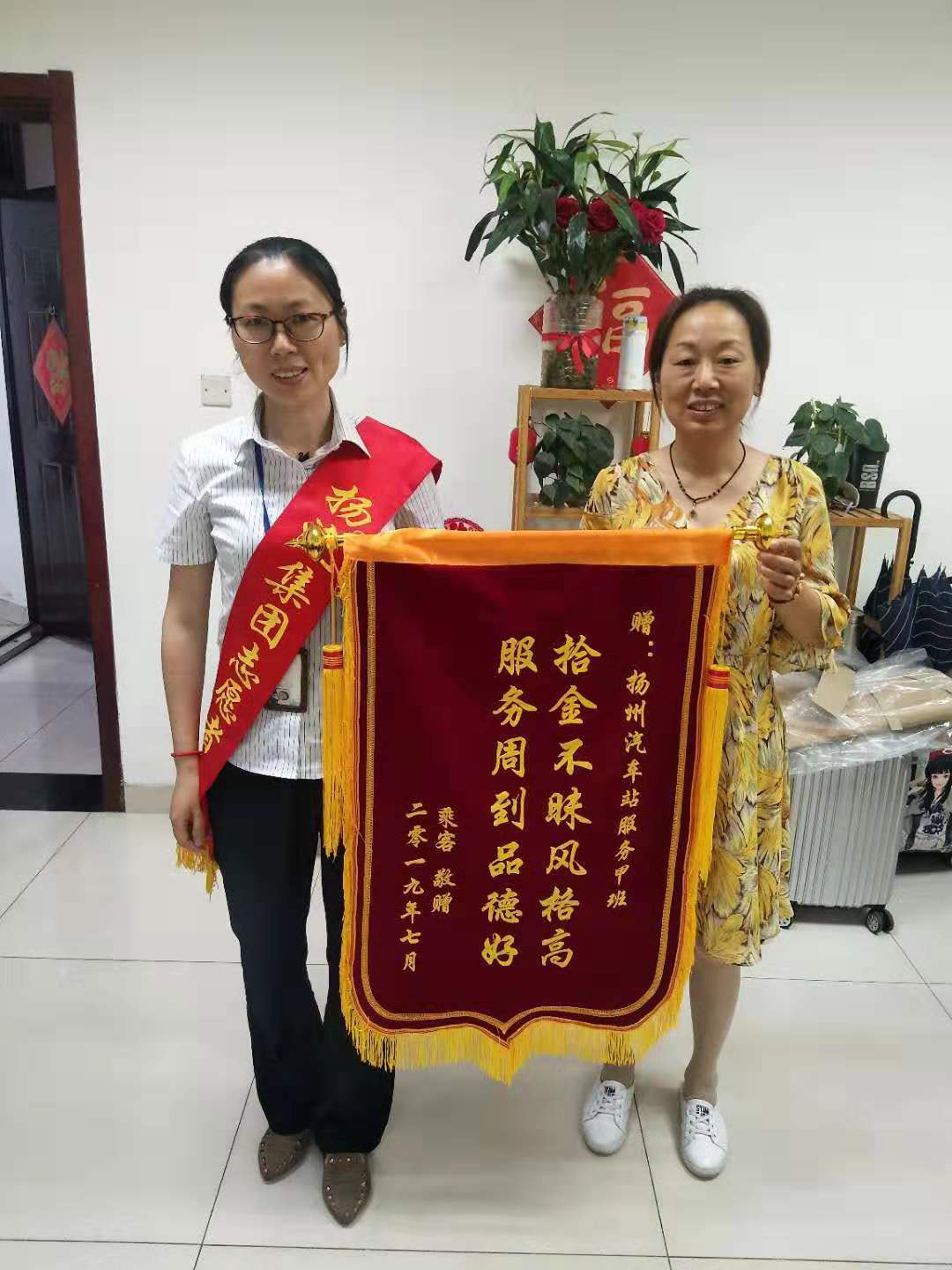 7月8日,一位揚(yáng)州市民王大媽,拿著錦旗來(lái)到揚(yáng)州汽車站值班室,感謝車站服務(wù)班工作人員,幫她尋找到遺失的錢(qián)包。
