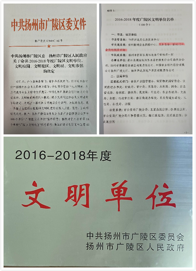 東站、五金市場獲2016--2018年度廣陵區(qū)“文明單位”榮譽(yù)稱號(hào)