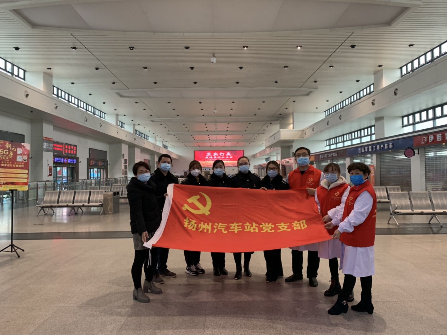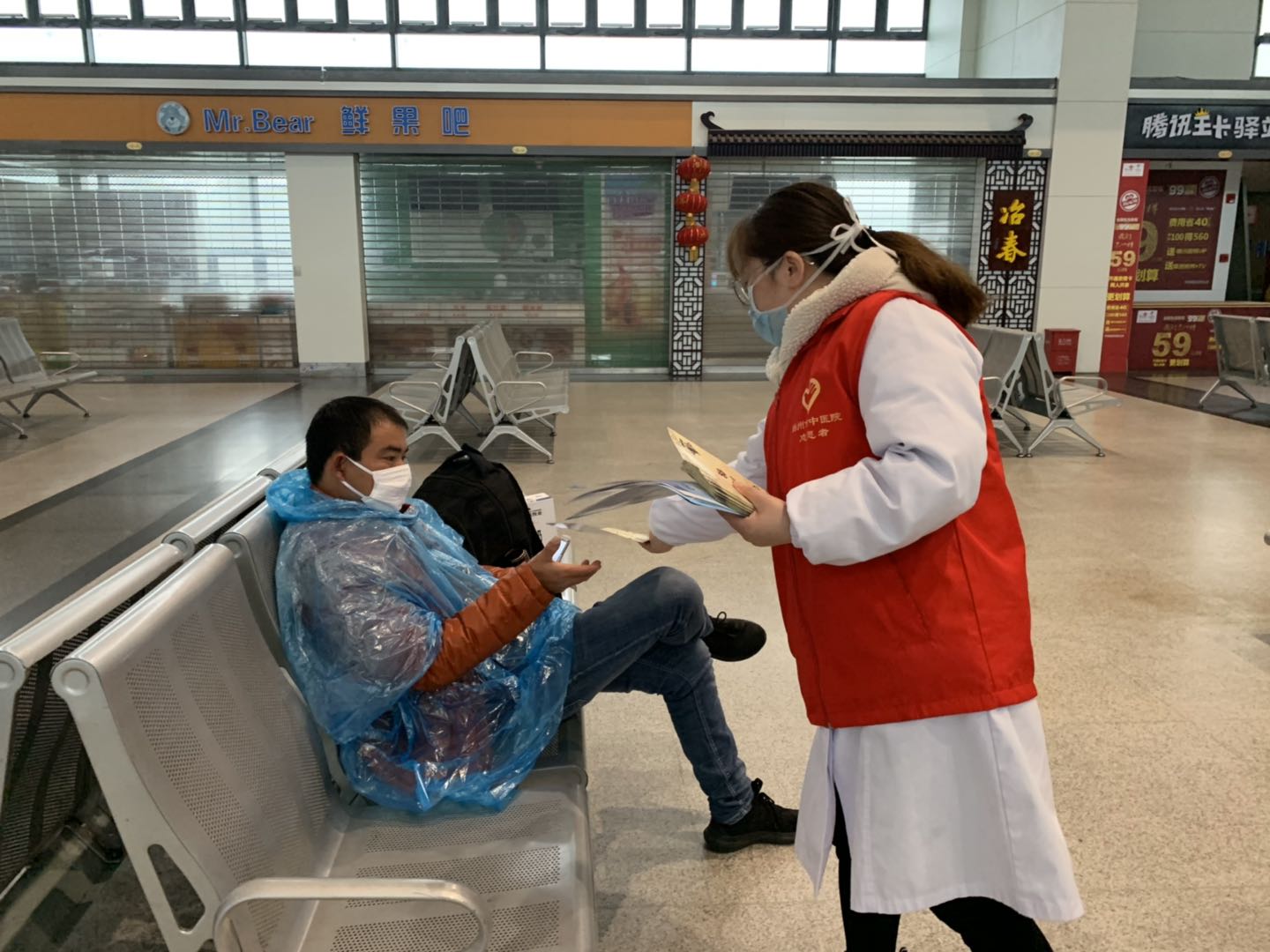 2月25日揚(yáng)州站復(fù)工復(fù)產(chǎn)的第二天,揚(yáng)州市中醫(yī)院抗“疫”小分隊為揚(yáng)州汽車站里的旅客們和堅守在一線崗位的職工送來了抗疫藥品和義診服務(wù)。