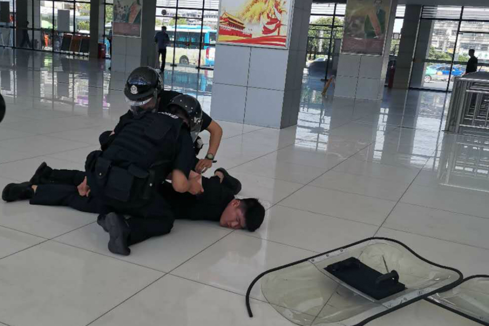 本次演練主要針對人員密集場所犯罪分子持刀砍殺旅客的警情進(jìn)行模擬。一名“黑衣男子”因生活受挫報(bào)復(fù)社會,在江都客運(yùn)站售票大廳內(nèi)持刀砍殺旅客。車站工作人員立即疏散旅客,利用110聯(lián)動中心緊急聯(lián)系警方。當(dāng)接到報(bào)警后,110指揮中心立即發(fā)出指令,要求江都區(qū)特警大隊(duì)、刑警大隊(duì)、交警大隊(duì)以及新區(qū)派出所人員攜帶裝備迅速趕到客運(yùn)站展開抓捕工作。警方將“嫌疑人”有效隔離后,迅速利用盾牌、鋼叉、抓捕器等防護(hù)武器將其制服。