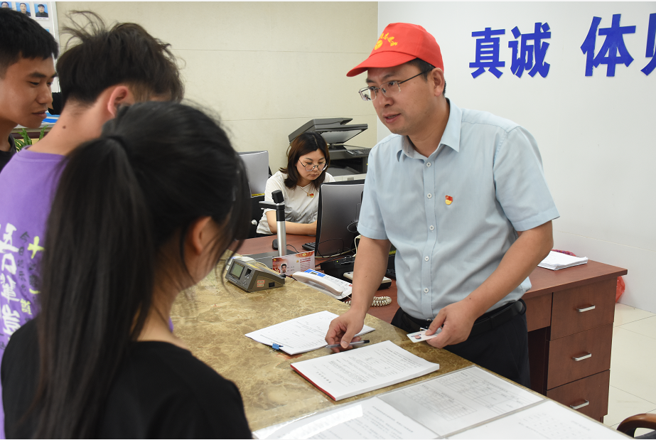 在報(bào)名大廳的服務(wù)現(xiàn)場,龔宇峰為前來學(xué)駕的學(xué)員登記報(bào)名信息,辦理手續(xù),并與他們交談,耐心解答他們的問題、囑咐在學(xué)習(xí)駕駛過程中需要注意的事項(xiàng)。