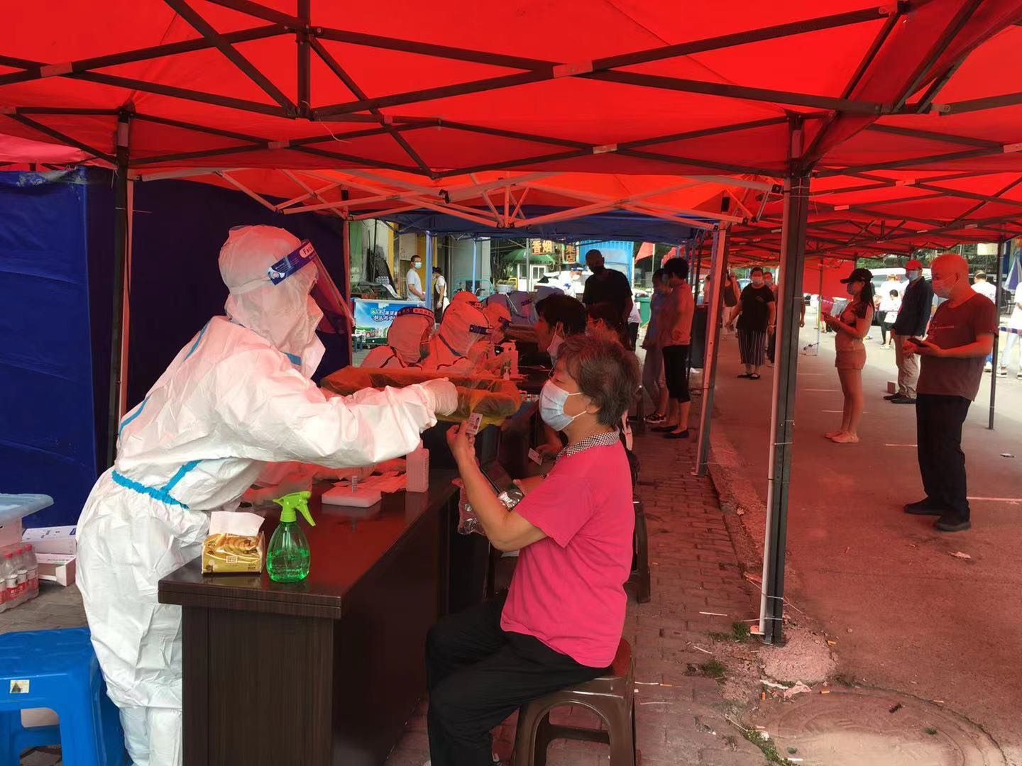 隨著時間的推延,戶外炎熱難耐,不是親身經(jīng)歷,真難以想象沖在第一線的醫(yī)護(hù)人員是怎么熬過來的。為時近幾個小時的這段艱難時光中,我好幾次覺得自己快缺氧窒息了,不過看著其他志愿者送來的降溫冰塊,給我們?nèi)韲姙⒕凭禍,誰又何嘗不是負(fù)重前行呢?在一次次鼓勵加油中,終于完成了上午的核酸檢測任務(wù),當(dāng)我脫下防護(hù)服后,衣服可以擠出水來,雙手被汗?jié)n泡的發(fā)白。同時,排隊(duì)做核酸的居民也很辛苦,個個汗流浹背,他們聽從指揮,秩序井然,有的向我們問候,“你們也辛苦了!”,心里很是感動。