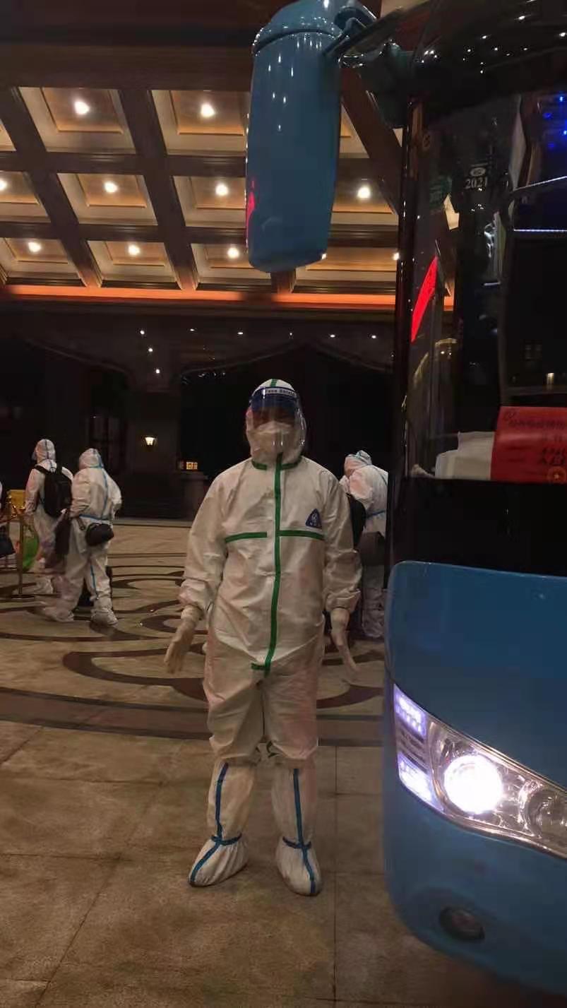 由于南京的疫情有所好轉(zhuǎn),家鄉(xiāng)揚(yáng)州的疫情又突發(fā),7月31日接到通知返回?fù)P州繼續(xù)“作戰(zhàn)”;氐綋P(yáng)州后到疾控中心做完核酸檢測一切正常,并前往酒店進(jìn)行隔離,準(zhǔn)備全身心投入后續(xù)轉(zhuǎn)運(yùn)工作。每當(dāng)執(zhí)行轉(zhuǎn)運(yùn)任務(wù)時,穿著防護(hù)服、戴著護(hù)目鏡開車,對有豐富駕駛經(jīng)驗(yàn)的他來說,仍是一個不小的挑戰(zhàn),全身被包裹得密不透氣,行動十分不方便,必須高度集中精神,小心駕駛確保行車安全。談及轉(zhuǎn)運(yùn)工作,魏建也記不清轉(zhuǎn)運(yùn)了多少趟隔離人員了,反正每趟任務(wù)都安全保質(zhì)保量的完成了。