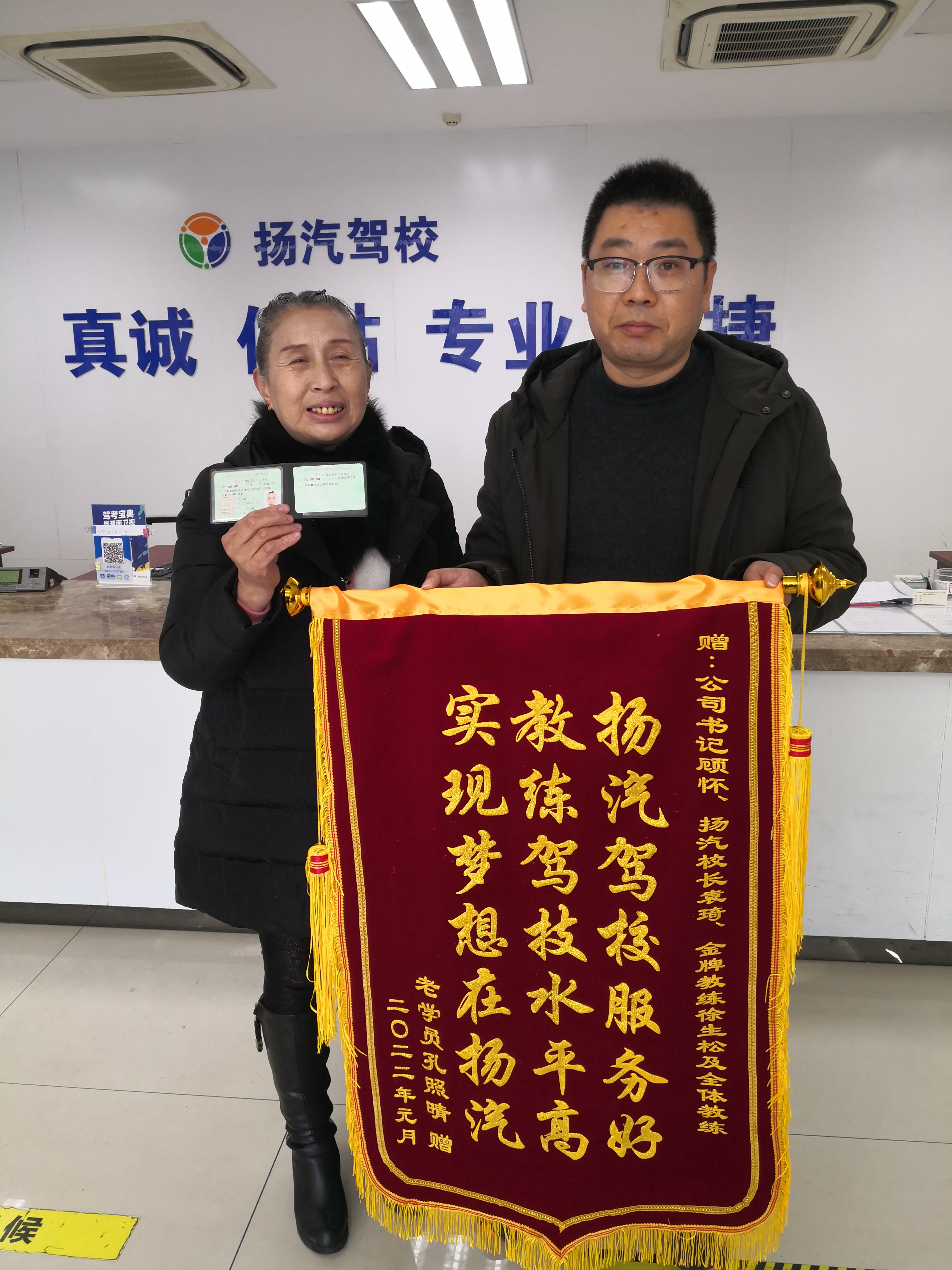 近日,67歲的孔大媽滿懷喜悅之情帶著新聞媒體的記者一同來到駕校,領(lǐng)取了她夢(mèng)寐以求的駕駛證,同時(shí)為駕校送上了“揚(yáng)汽駕校服務(wù)好 教練駕技水平高 實(shí)現(xiàn)夢(mèng)想在揚(yáng)汽”的錦旗。