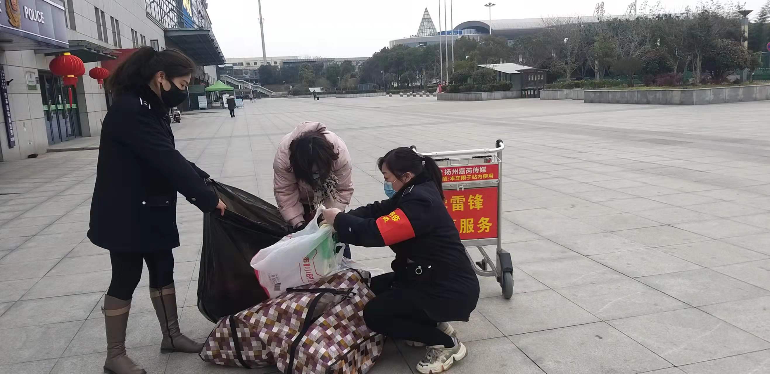 1月29日下午4點時分,西部客運樞紐揚州汽車站務(wù)中心工作人員殷丹和薛揚,日常工作巡查時,在站前廣場進口處,看到一名旅客蹲在地上,手里抱著散落一地的行李無計可施,焦急萬分。