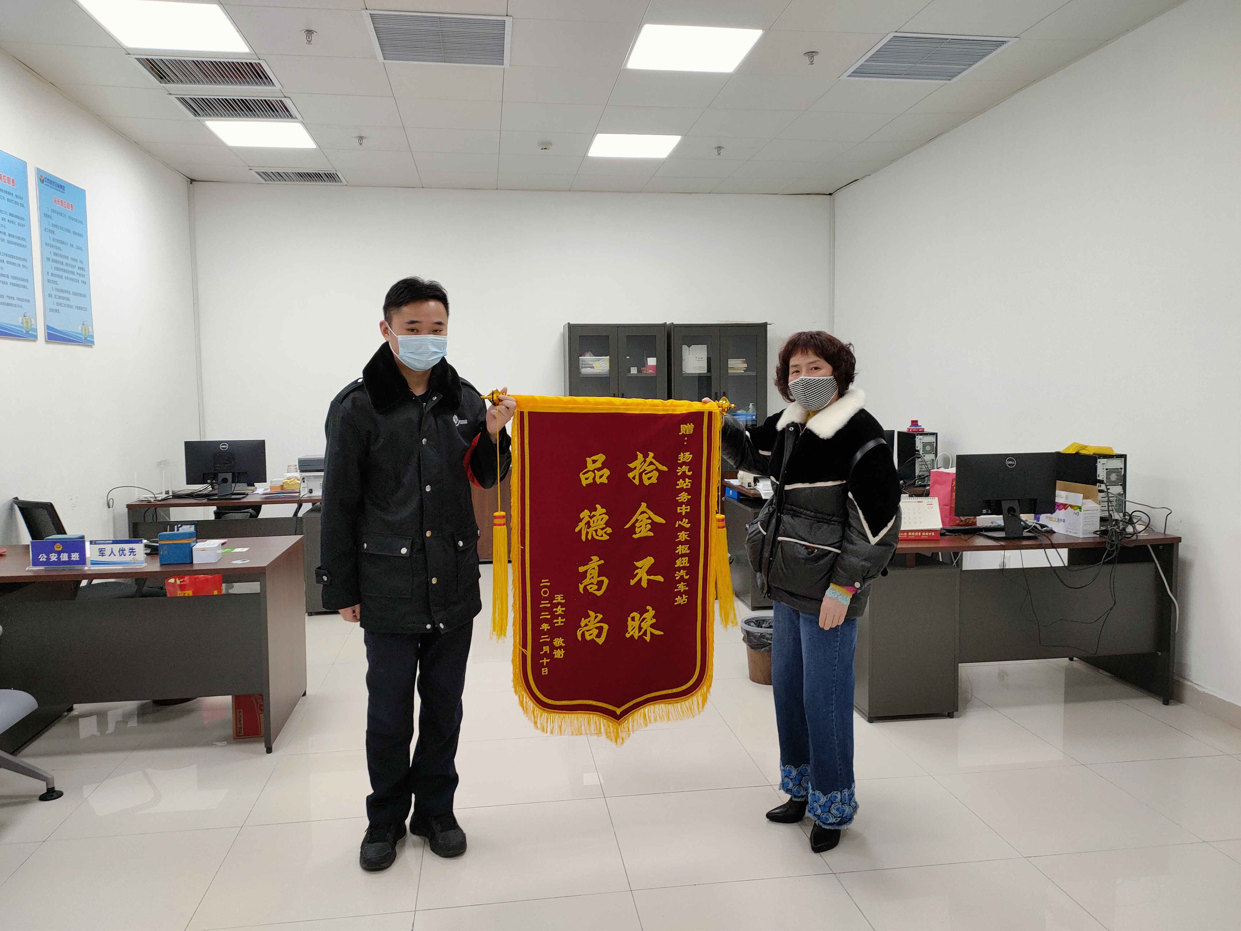 2月8日下午18:00,揚(yáng)州東樞紐汽車站至泰州南站最后一班車即將發(fā)車,臨近發(fā)車點(diǎn),一名旅客匆匆在售票處購票后帶著行李上二樓乘車,此時值班員姜衛(wèi)軍突然接到服務(wù)臺電話,售票員李玲說道,剛才有名旅客為了趕泰州班車,錢包落在了售票臺上。姜衛(wèi)軍隨即趕到現(xiàn)場,經(jīng)問詢,該班車已準(zhǔn)點(diǎn)駛出車站,在與駐站民警溝通后,確認(rèn)錢包內(nèi)裝有3000元現(xiàn)金、社保卡及銀行卡若干,為消除旅客的焦慮情緒,姜衛(wèi)軍也是第一時間與王女士取得聯(lián)系。