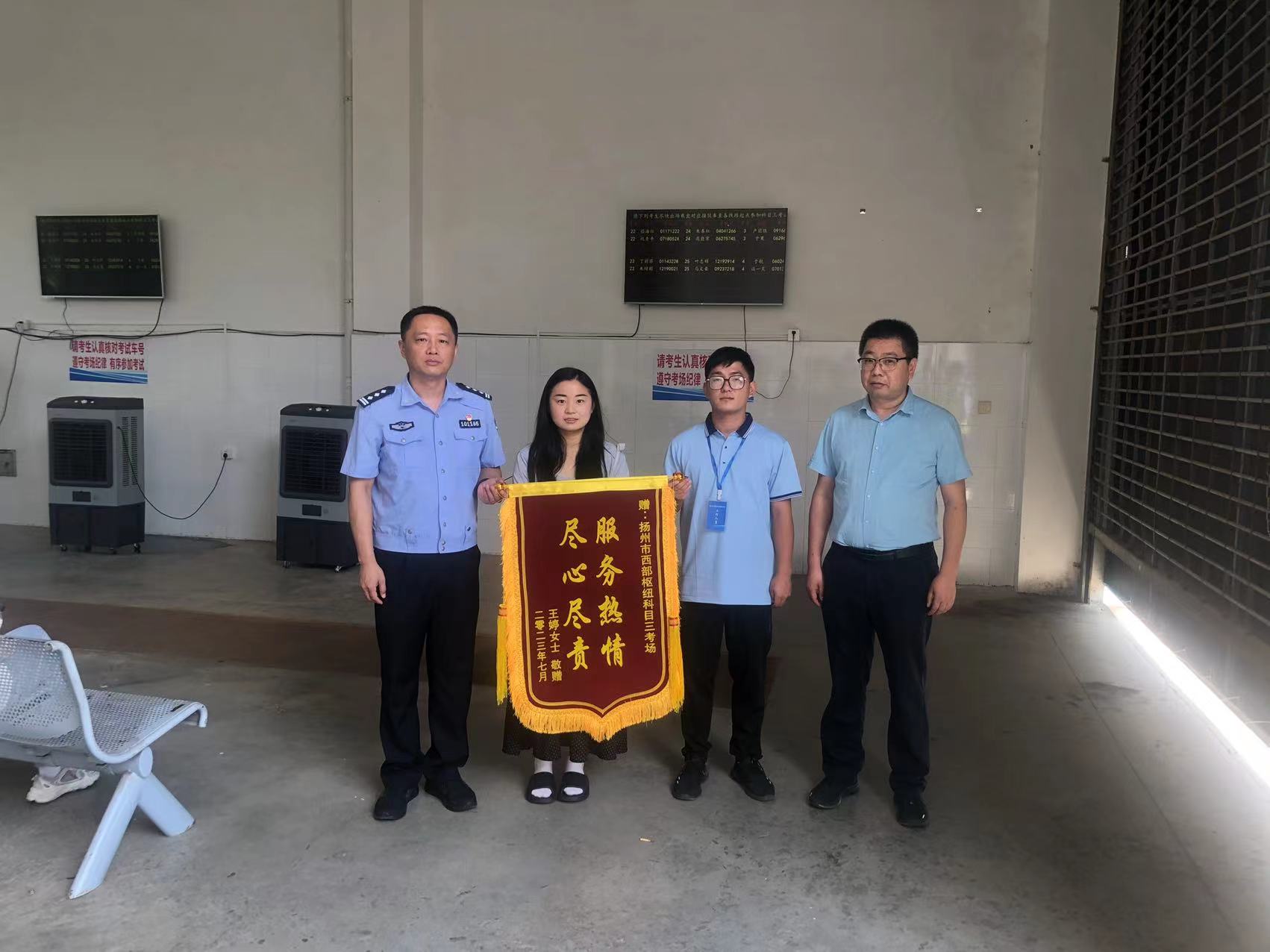 7月27日,揚州西部客運樞紐科目三考場收到了一面錦旗,印有“熱情服務(wù),盡心盡責”,王婷女士將錦旗交至車管所監(jiān)管人員和考場負責人手中,對現(xiàn)場工作人員的幫助表示感謝。