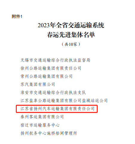 近日,省交通運(yùn)輸廳下發(fā)的《關(guān)于表?yè)P(yáng)2023年全省交通運(yùn)輸系統(tǒng)春運(yùn)先進(jìn)集體和個(gè)人的通報(bào)》,揚(yáng)汽集團(tuán)被授予“2023年全省交通運(yùn)輸系統(tǒng)春運(yùn)先進(jìn)集體”榮譽(yù)稱(chēng)號(hào)。