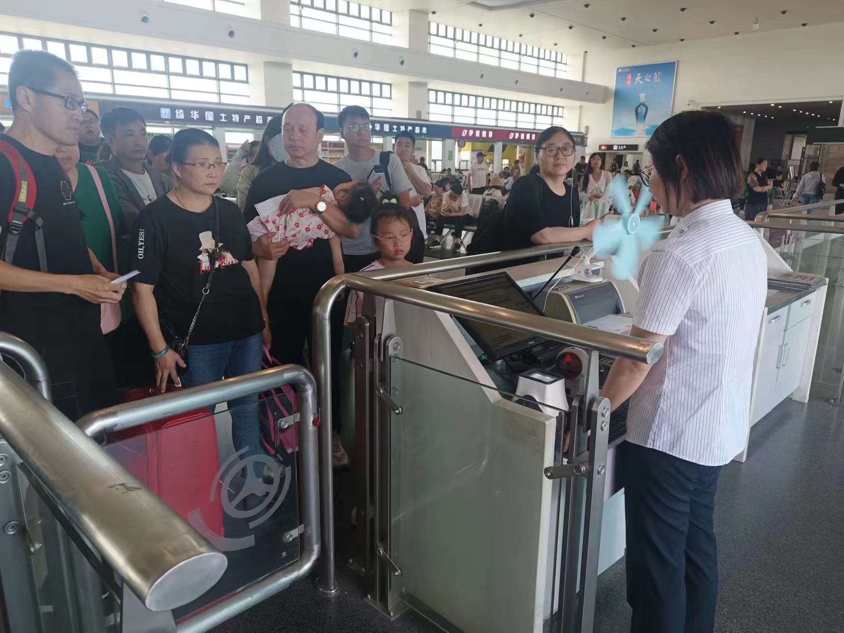 三、提升服務品質(zhì),營造溫馨環(huán)境。積極組織人員服務一線,到班次多、客流大的重點區(qū)域、重點門號,加強現(xiàn)場保障力量,為廣大旅客特別是老幼病殘孕軍等重點旅客提供問詢向?qū)Аf(xié)助購票、行李幫提、秩序維護、解答咨詢等全方位服務,切實保障廣大旅客安全、有序、溫馨、便捷出行。